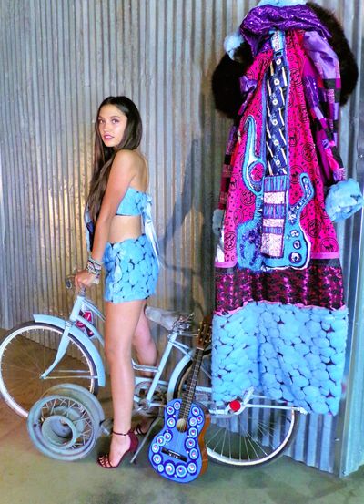 The RETRO ROCKER BLUES COLLECTION draws inspiration from music, dance, and sustainable design with eco-conscious materials. It captures the spirit of rock culture and green design by combining traditional sewing with surface design techniques. These include hand-painting, beadwork, and textile-assemblage patchwork. An electric-blue guitar, stitched, painted, and appliquéd, appears as the centerpiece on an embellished patchwork coat. Plush sky-blue textures, faux fur trims, and vibrant magentas contrast with industrial metal hues. Each garment celebrates performance, reflecting musical rhythms. The collection turns fabric into a visual narrative, celebrating artistic freedom and retro Americana. It translates sound into stitch, fashion into stage, and material into memory.